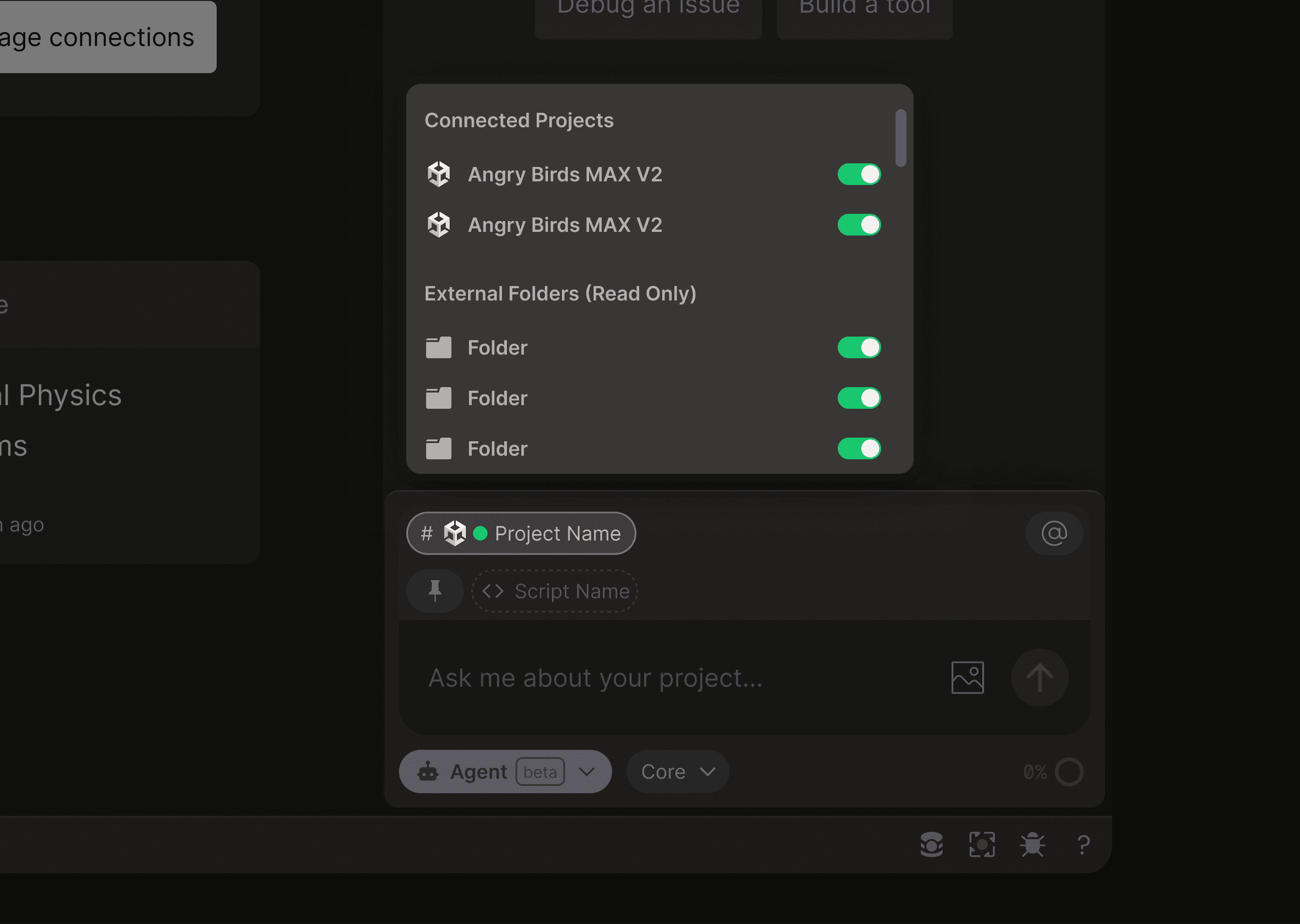 Beyond the active project, you control which connected projects Bezi reads as additional context. Working on a feature that calls into a shared utility library? Toggle it on. Focused on a self-contained task? Narrow the context down to a single project. This granularity lets you direct Bezi's attention to only what is relevant and protect against drops in response quality due to context overload.