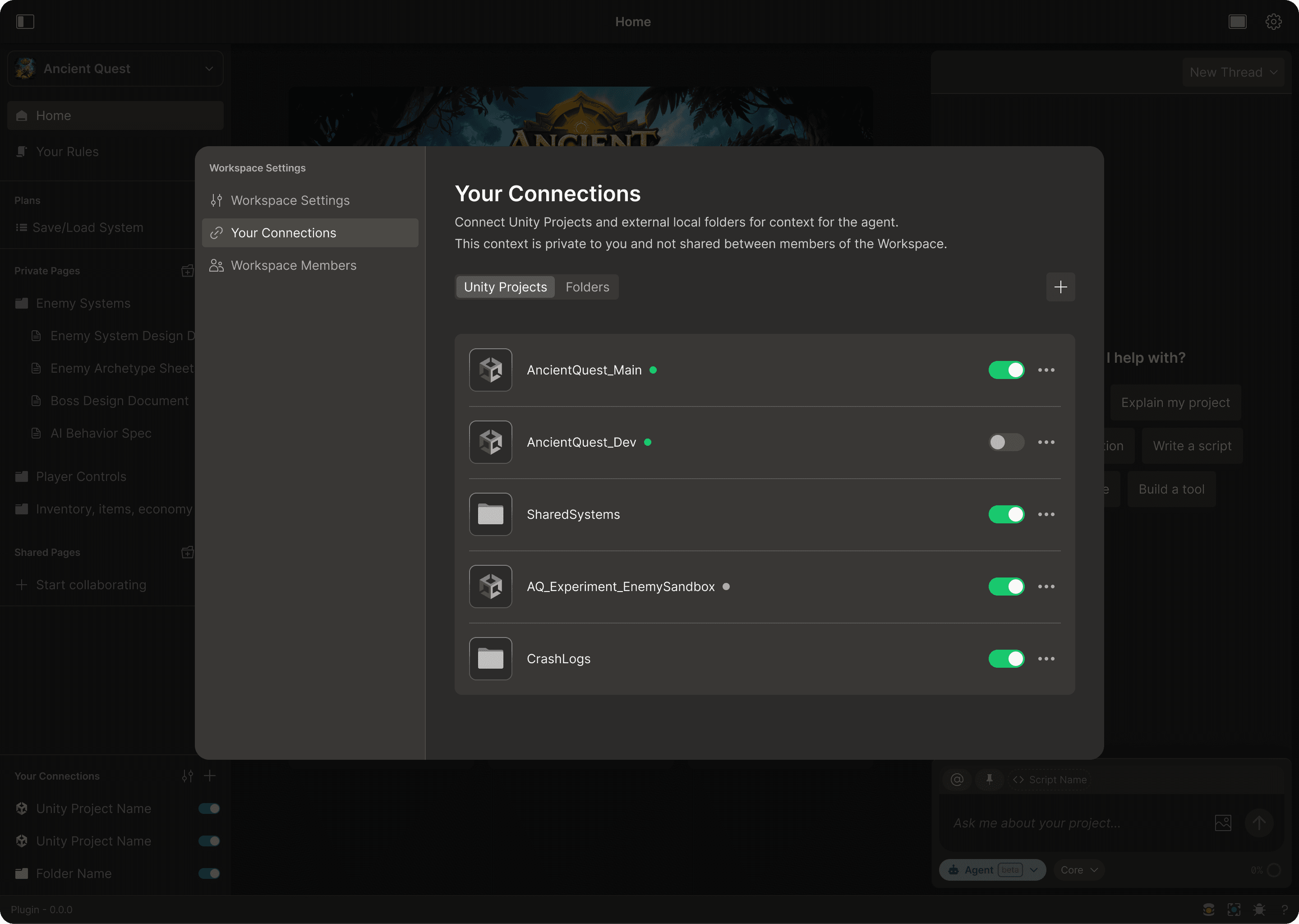 Server-side code, build tooling, design documents, concept art - all of this informs your game, but until now, Bezi couldn't see any of it. You can now connect any local folder on your machine to a Workspace, and Bezi will index its contents alongside your Unity projects, as full context it can read from and write to.