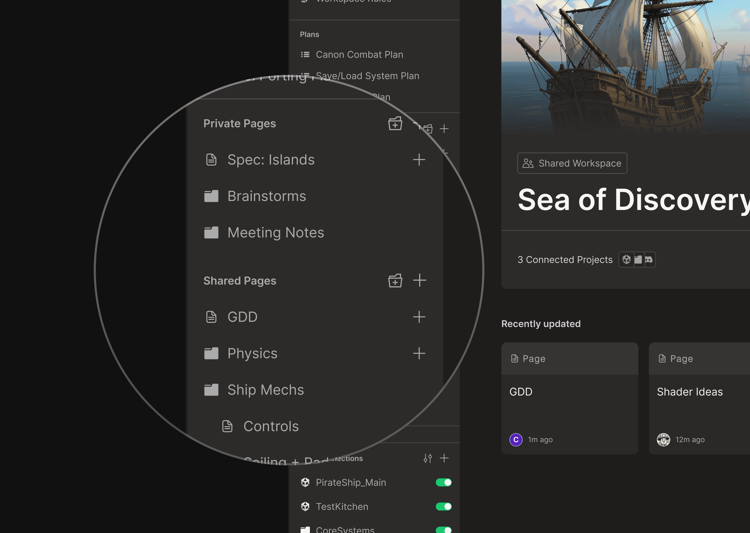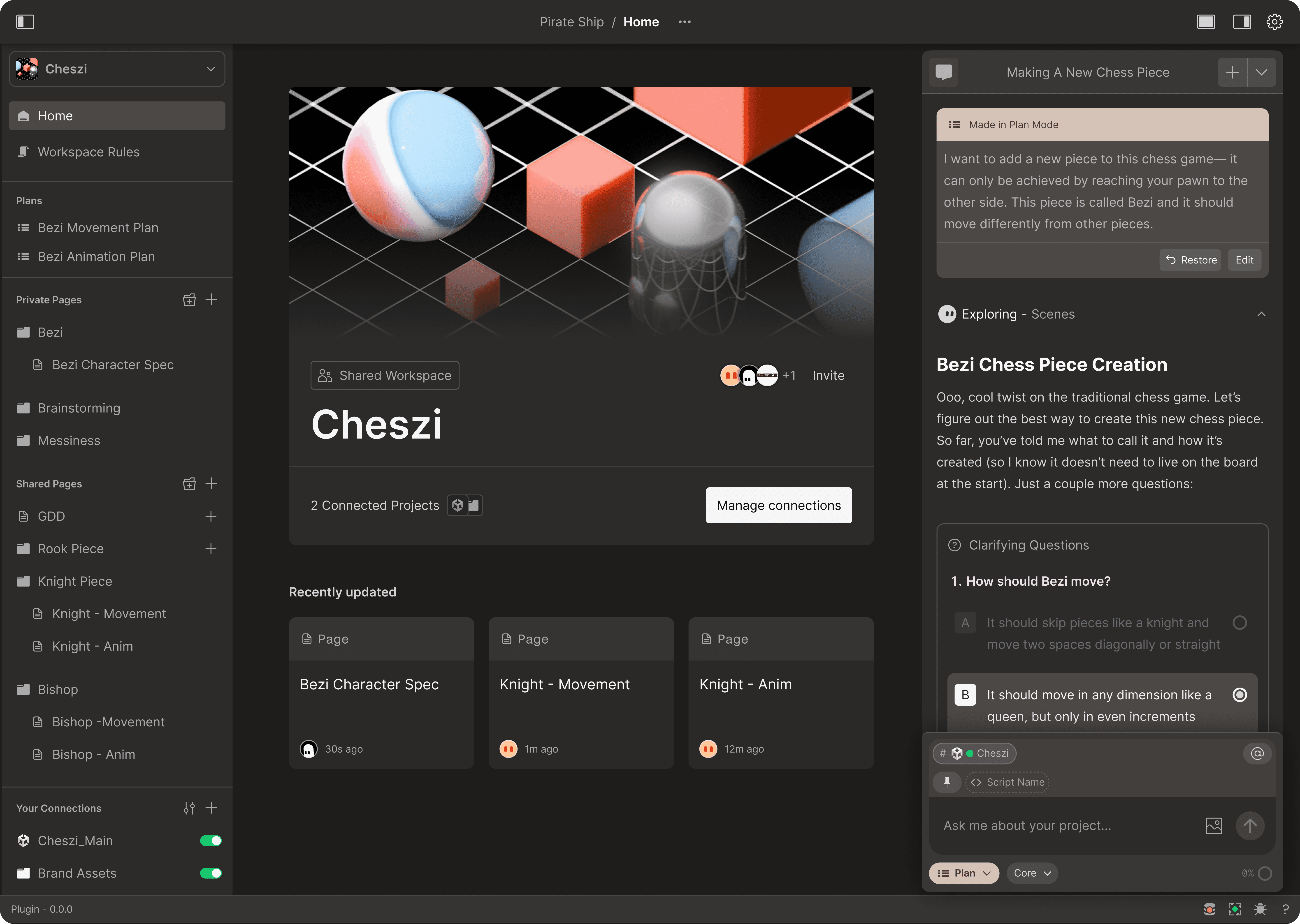 Workspaces introduces an organizational layer above individual Unity projects. You group related Unity projects, local folders, and Pages together under a single Workspace - and all of it becomes persistent knowledge that Bezi draws from, across everything you're building. Bezi can read and write across your full Workspace, so you can iterate on every layer of your game in parallel, regardless of where it is housed. Teams can create shared Pages that every member's Bezi references, with version history for async collaboration.