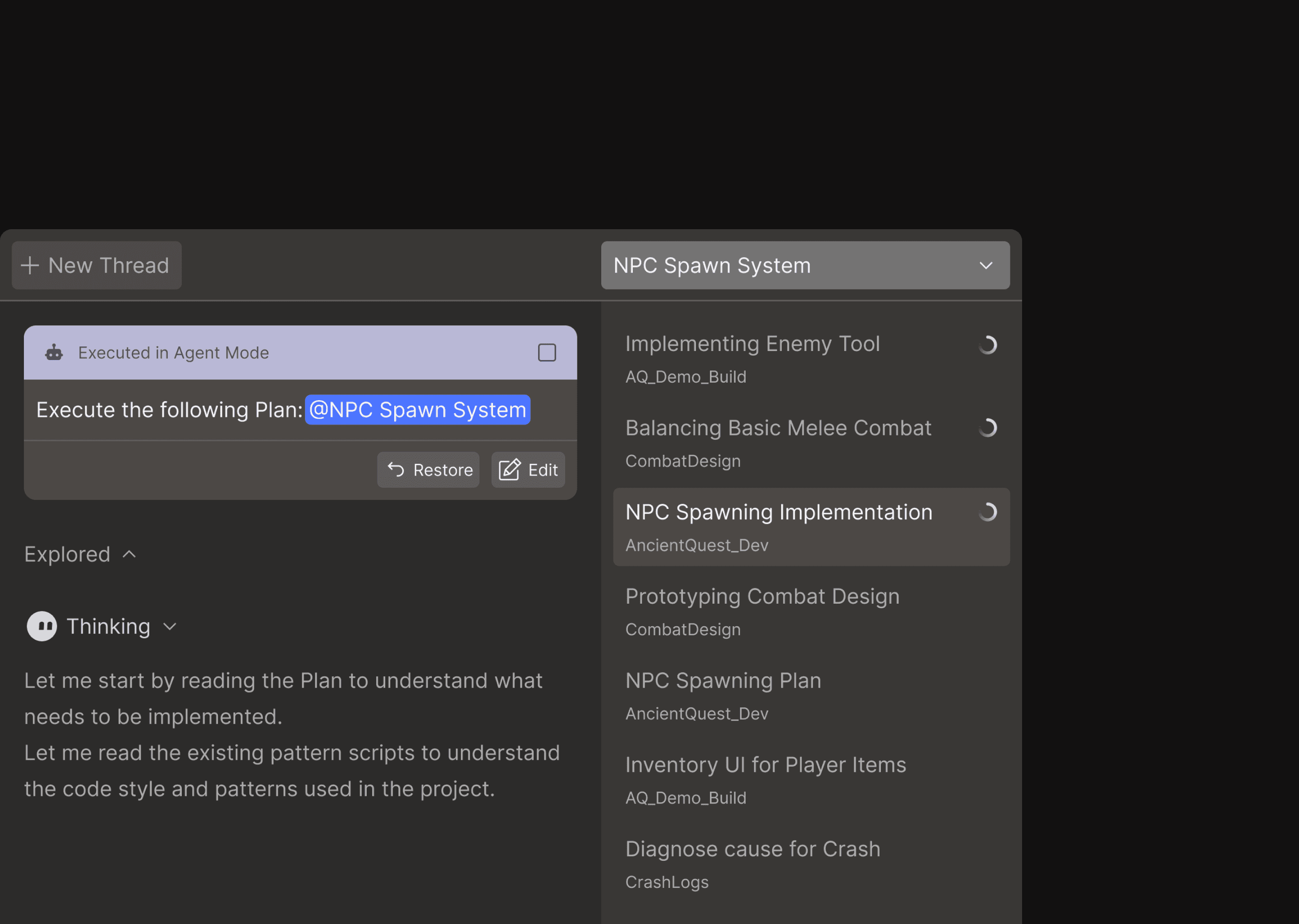 This workflow allows you to keep your train-of-thought moving while Bezi handles assembly in the background. Submit an Agent Mode prompt to execute a plan, create scripts, and configure components, then switch to a new thread to do research for another mechanic and plan out its implementation. By the time Bezi’s finished its changes, you’ve got the next task thought out and ready to go.