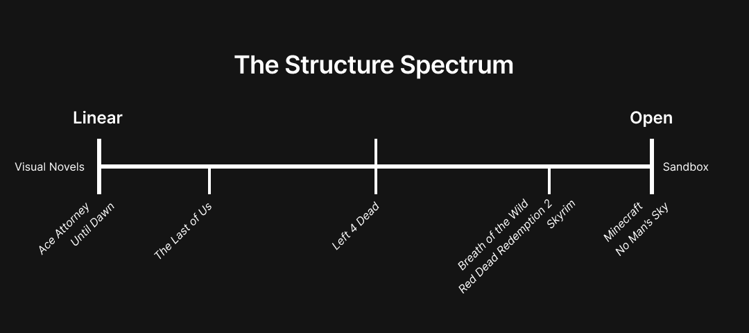 We categorize games on a spectrum from linear - with constrained goals, specific endpoints, and preplanned stories - to open exploration experiences.