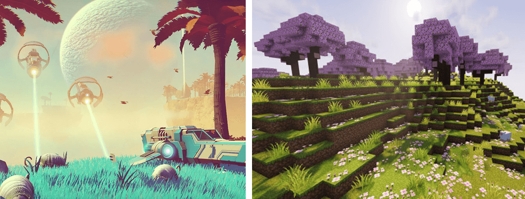 No Man’s Sky (left) and Minecraft (right) top lists of procedural game worlds, with biomes and environments generated in real-time.