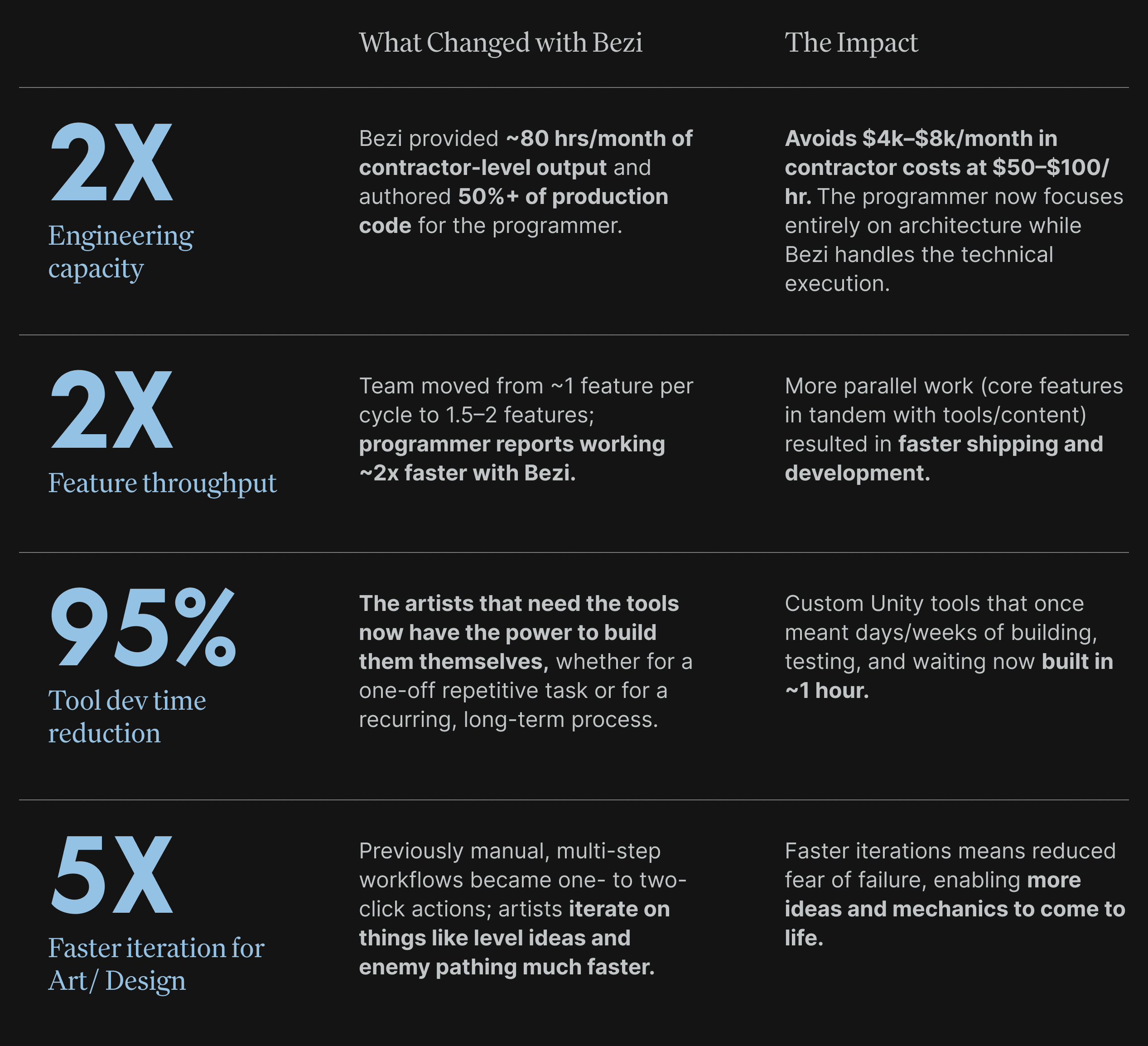 The team's own assessment is that using Bezi has resulted in the same output as hiring another senior programmer, contracted to work 80 hours a month.