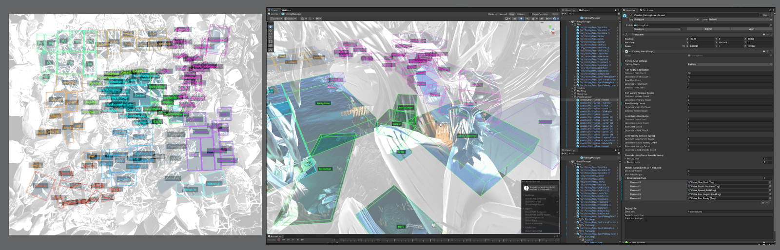 The FishingManagerDisplay: A simple editor script that identifies all fishing area objects, visualizes their bounds, and labels them for easy adjustment, organization, and identification.