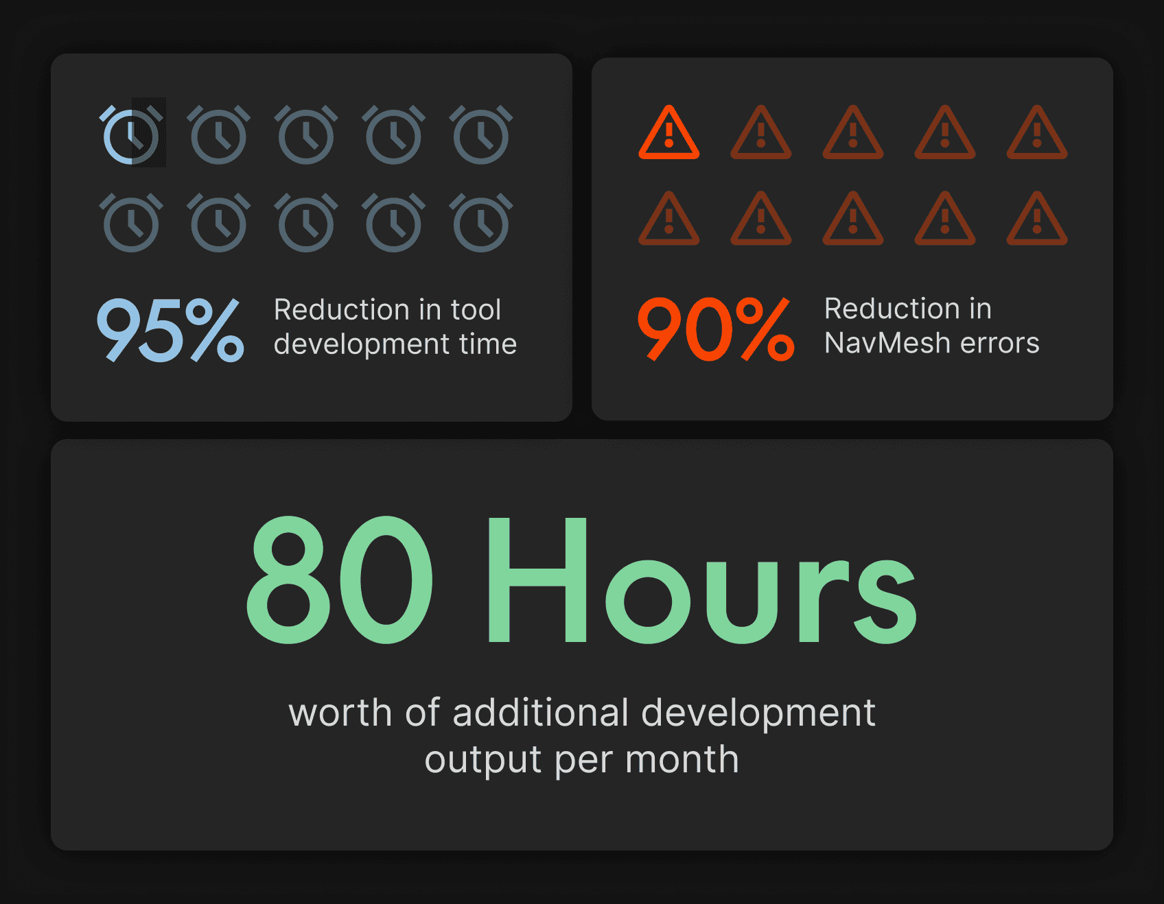 The Impact: This shift effectively doubled the team's engineering capacity, freeing up an estimated 80 hours of programmer time per month (20 hours a week) and accelerating their overall feature velocity by up to 2x, giving them the kind of competitive edge typically reserved for much larger studios with dedicated tool development teams.