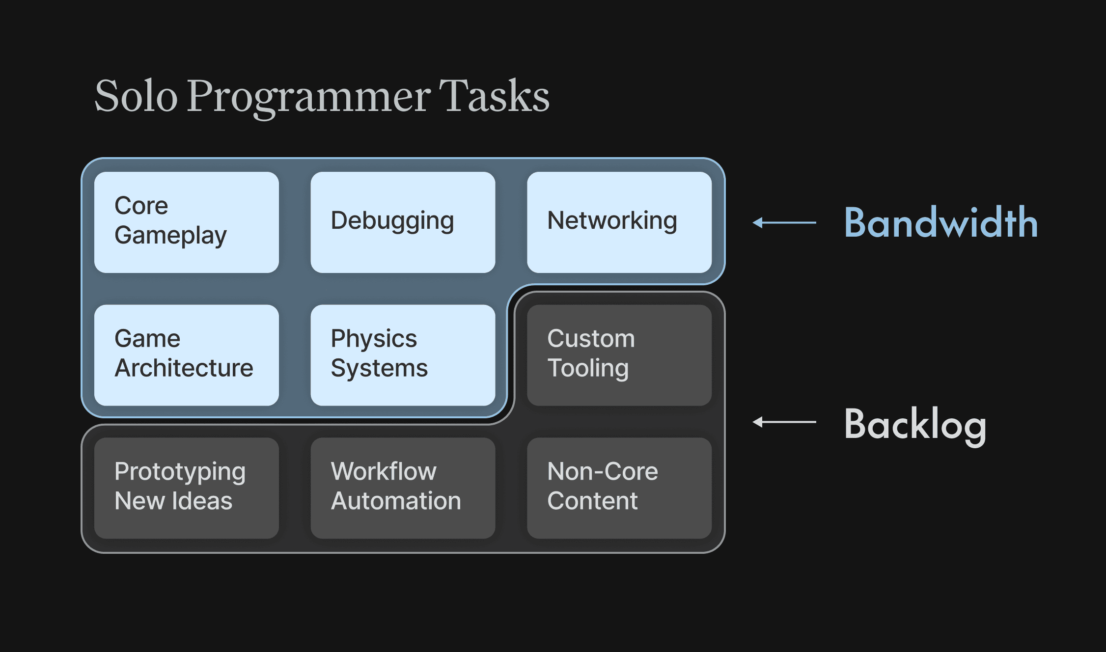 With Mark as the sole programmer, he was constantly pulled in different directions, juggling high-value, complex engineering problems (core gameplay mechanics and physics systems) with a queue of smaller support tasks and tool requests from the team. This programmer bottleneck became a direct cap on the game's quality and the team's creative freedom.