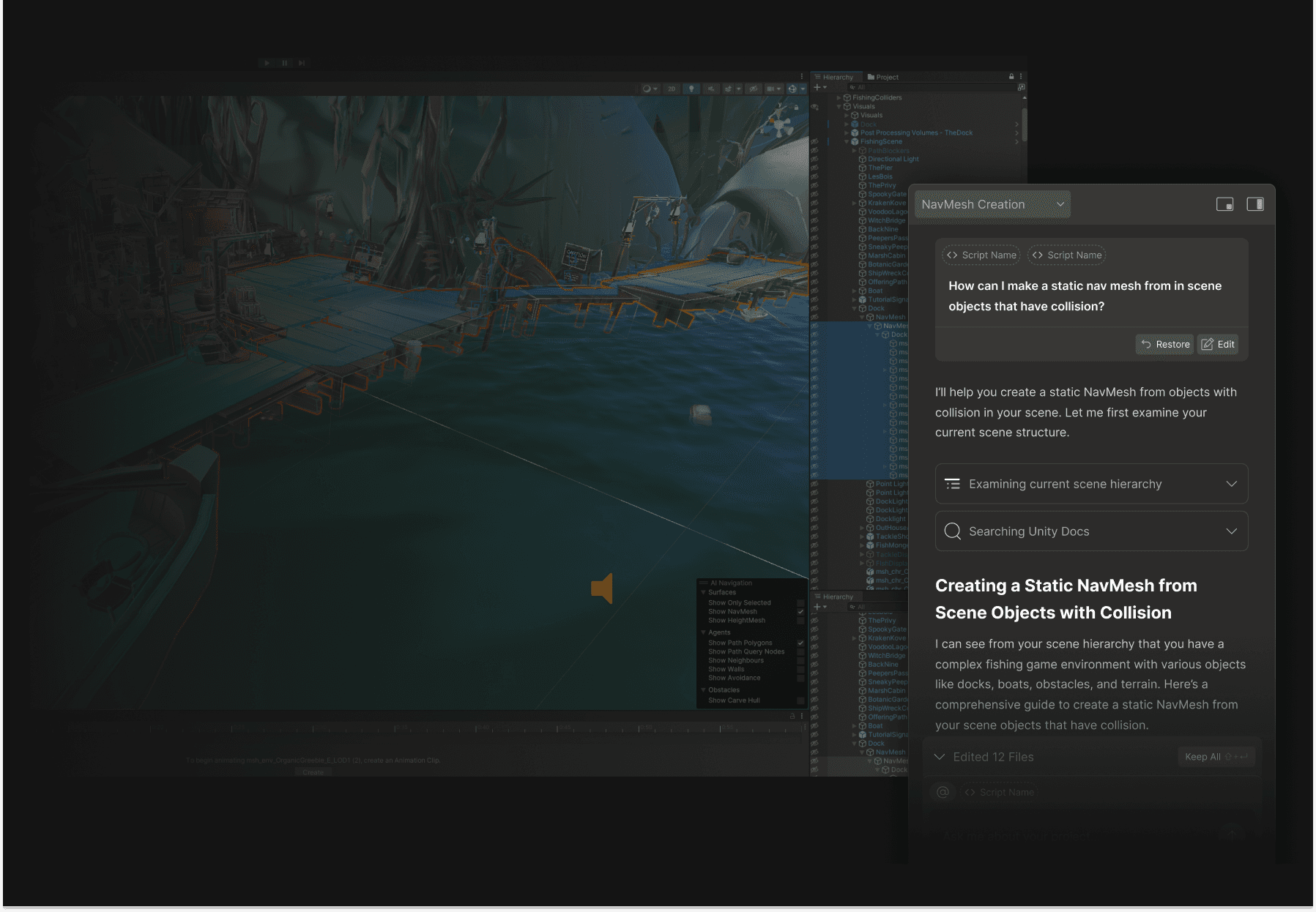 Any team member can create custom tools to streamline their exact workflow. Automate scene setup, navmesh generation, level building tools, and more. Build them in minutes, unblock yourself immediately.